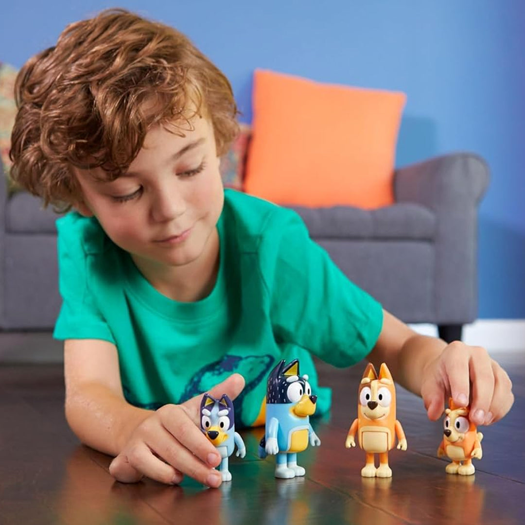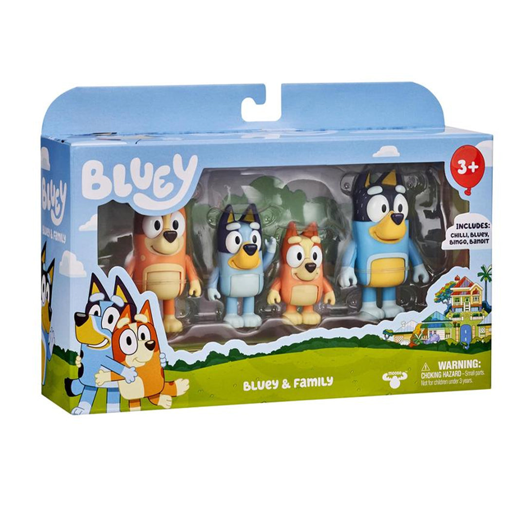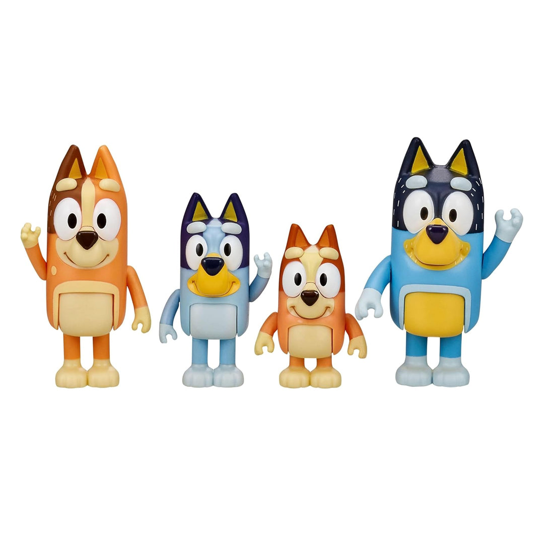 El pack de 4 figuras de Bluey y su familia incluye las figuras de Bluey, su hermana pequeña Bingo, su padre Bandit y su madre Chilli.