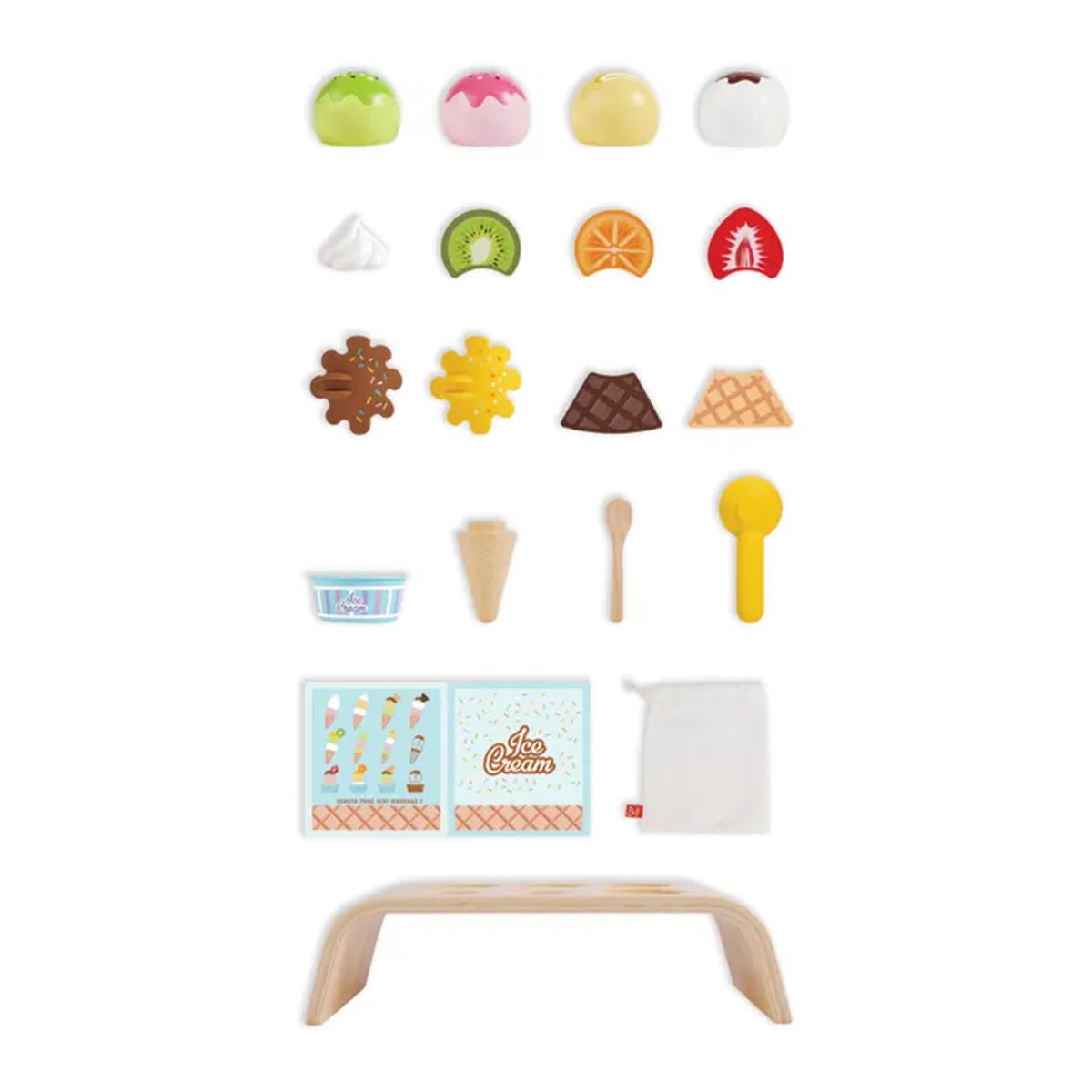 * **MUCHOS ACCESORIOS:** Incluye una estantería expositora, cuchara, conos, copas, bolas de helado, mermelada, toppings de frutas y postres, un "menú" y una bolsa de almacenamiento.