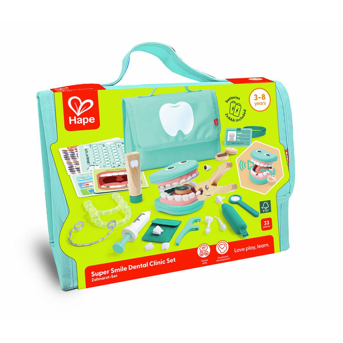 Haz que el cuidado dental sea divertido con el **Juego de Clínica Dental Super Smile** de Hape. Este set interactivo convierte la visita al dentista en una experiencia educativa y entretenida, con herramientas realistas como cepillo de dientes vibrador, espejo dental y dientes de juguete electrónicos. Perfecto para fomentar hábitos saludables, habilidades motoras finas y el juego de roles creativo.