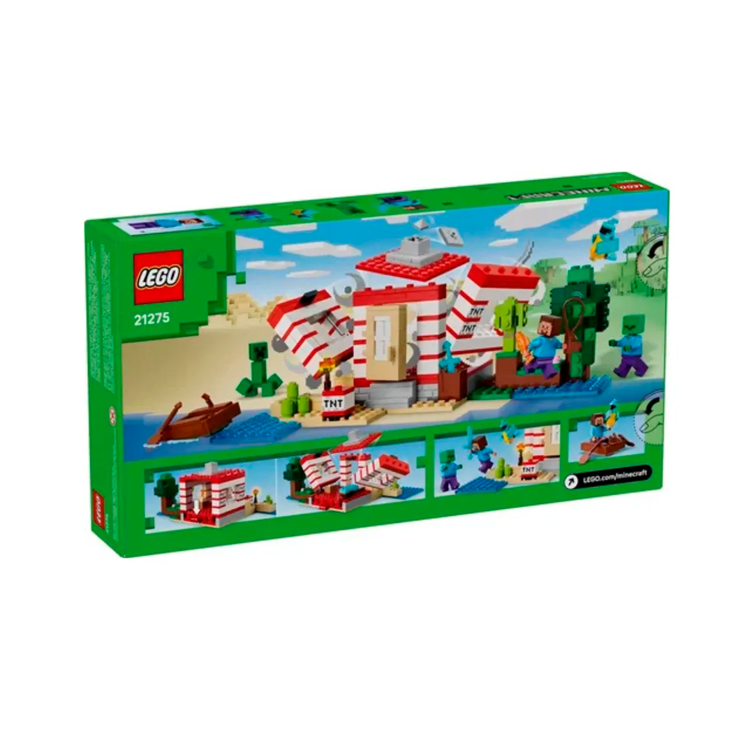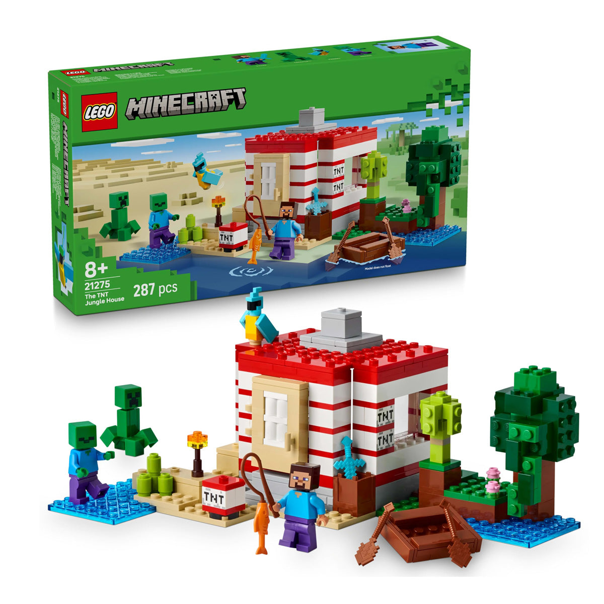El set incluye minifiguras de Steve, un Creeper y un zombie, además de accesorios como un bote, una caña de pescar, un pez, un loro y follaje de jungla.