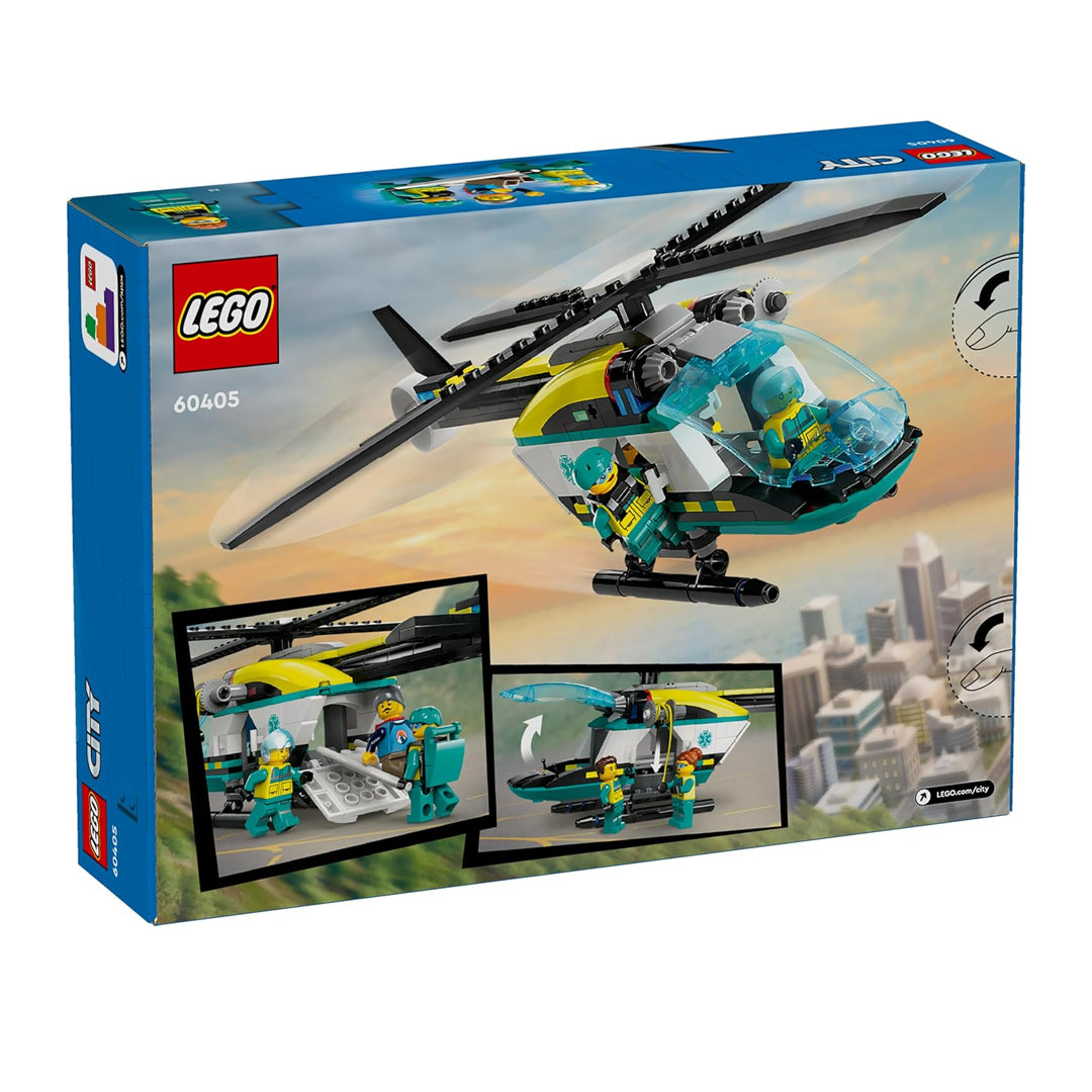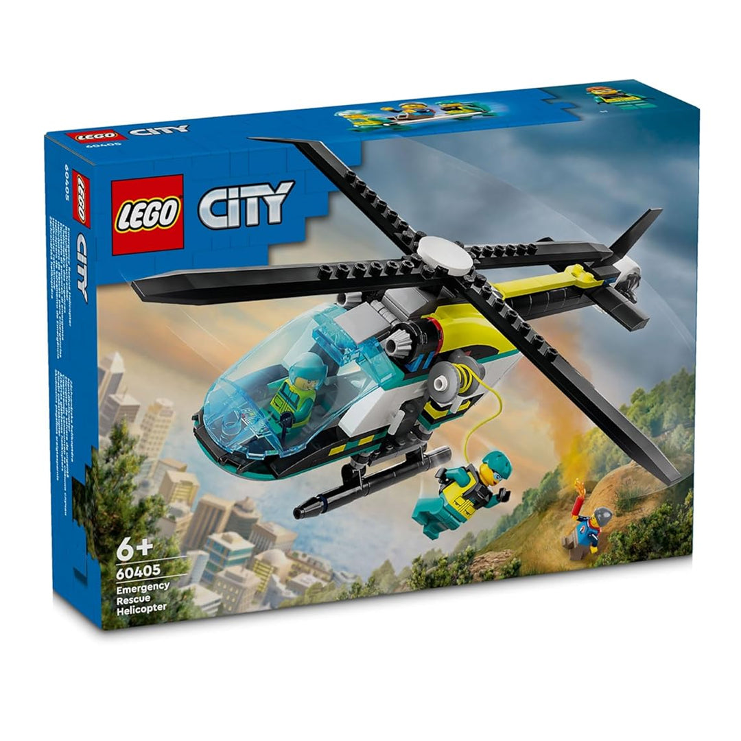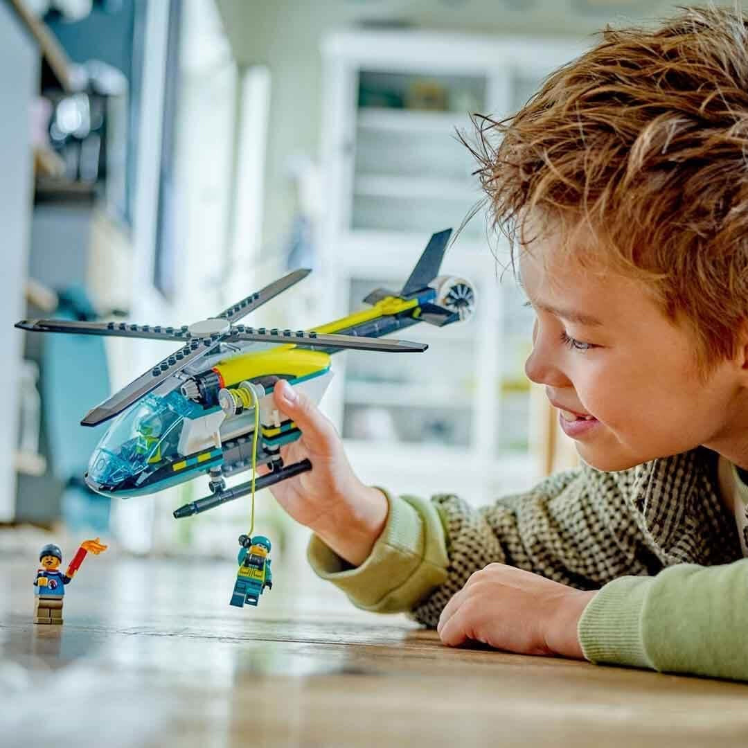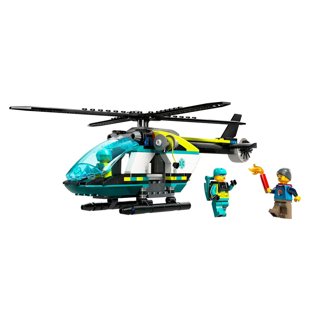 El set incluye un helicóptero con cabina, rotores giratorios, bodega de carga que se abre y cabrestante que funciona.