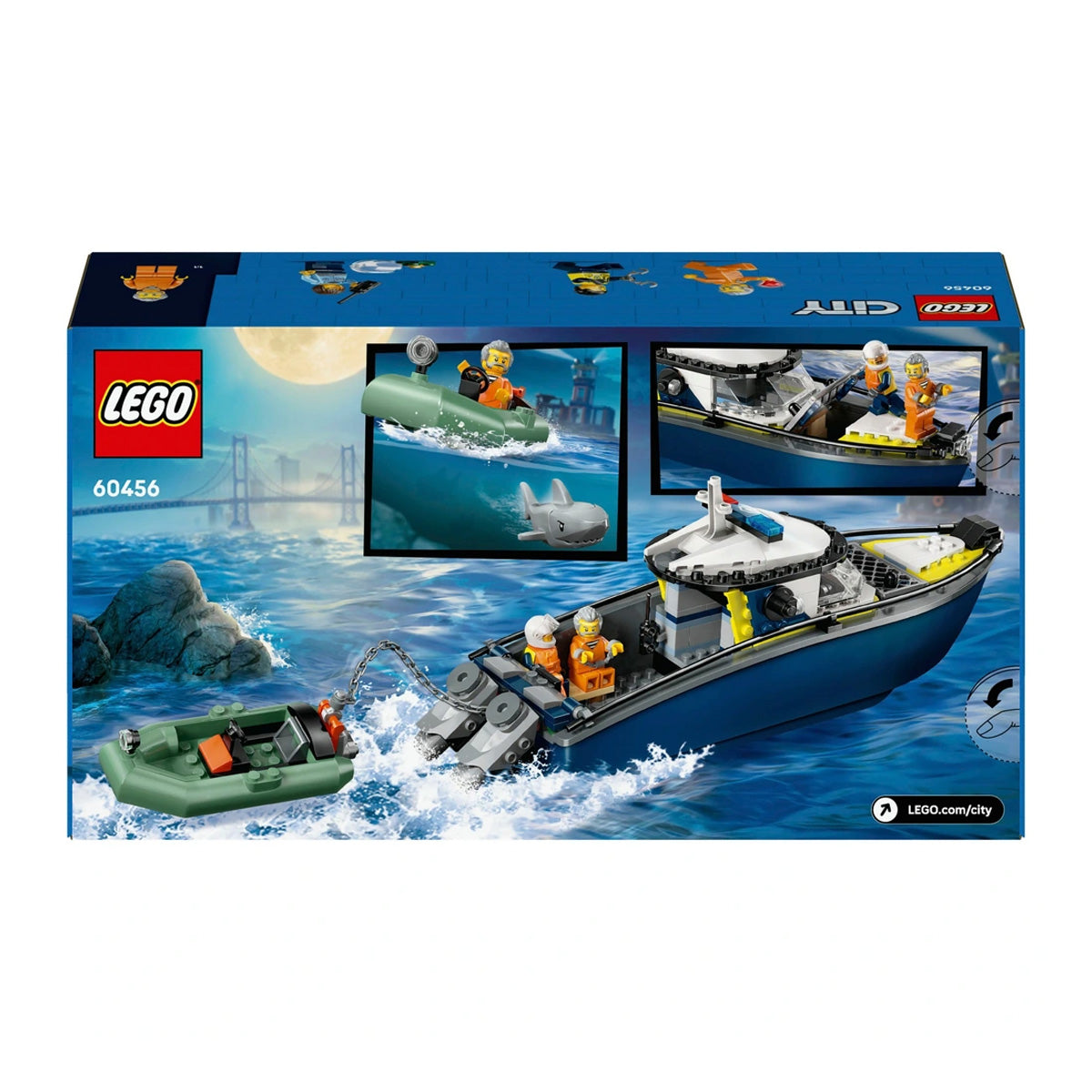Incluye un barco policial con doble motor y celda interna, una lancha de fuga del criminal, dos oficiales, un ladrón, un tiburón y una joya robada. Las embarcaciones flotan de verdad para jugar en el agua.