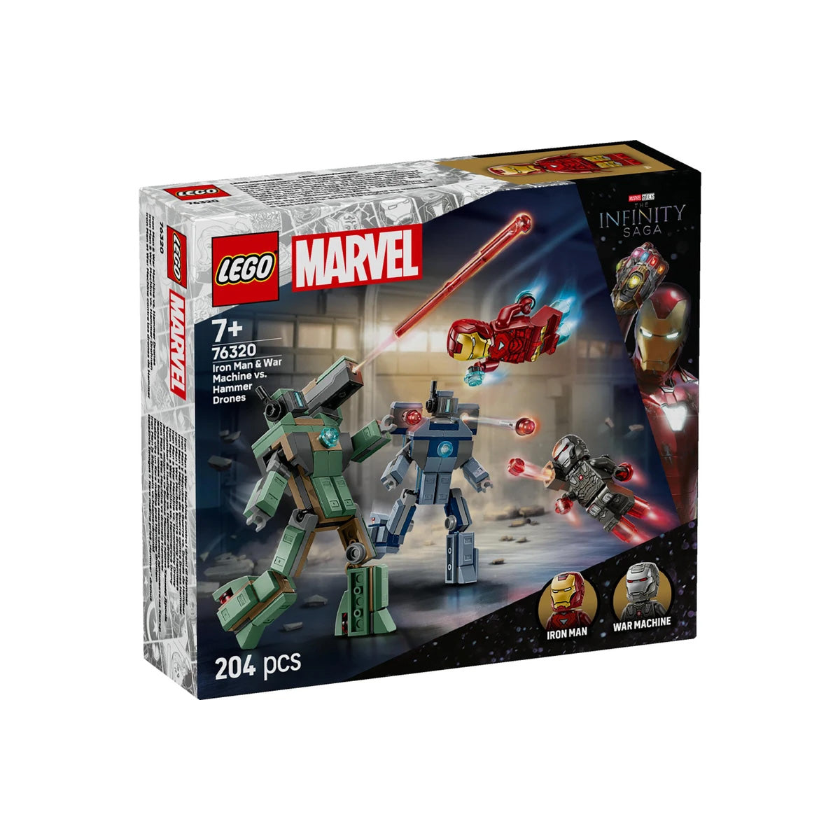 Incluye las minifiguras de Iron Man y War Machine, junto con drones armados inspirados en las épicas batallas de la saga.