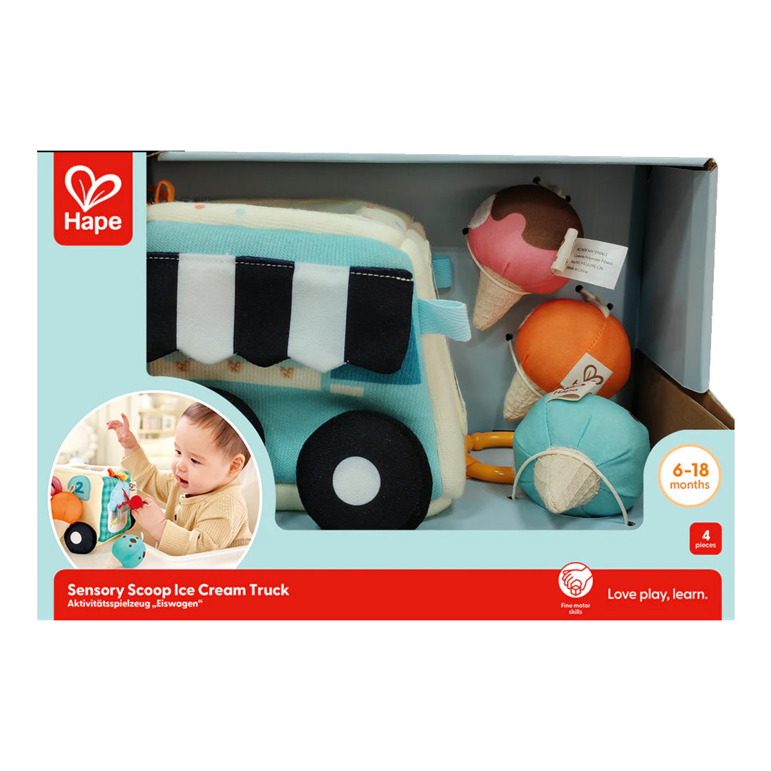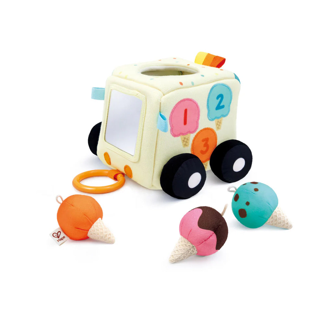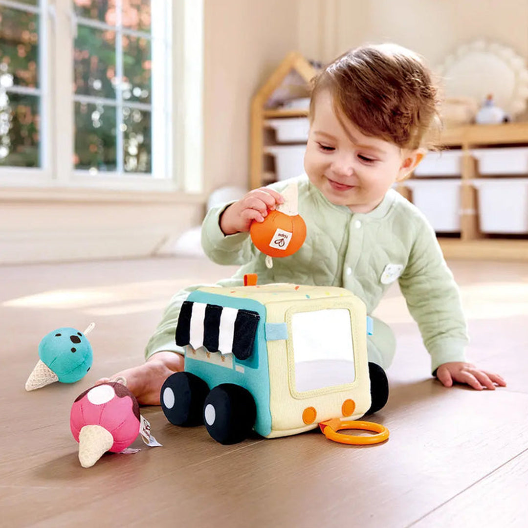 Este camión de helados sensorial de peluche es una aventura de descubrimiento para bebés desde los 6 meses.