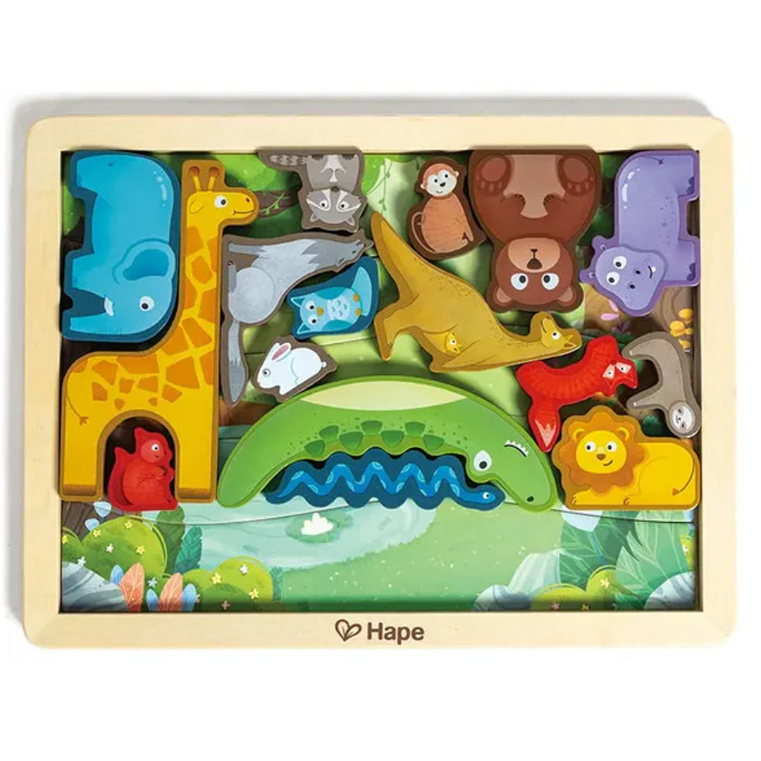 Disfruta de los sonidos de los animales y aprende datos curiosos sobre la fauna salvaje con este colorido rompecabezas apilable.